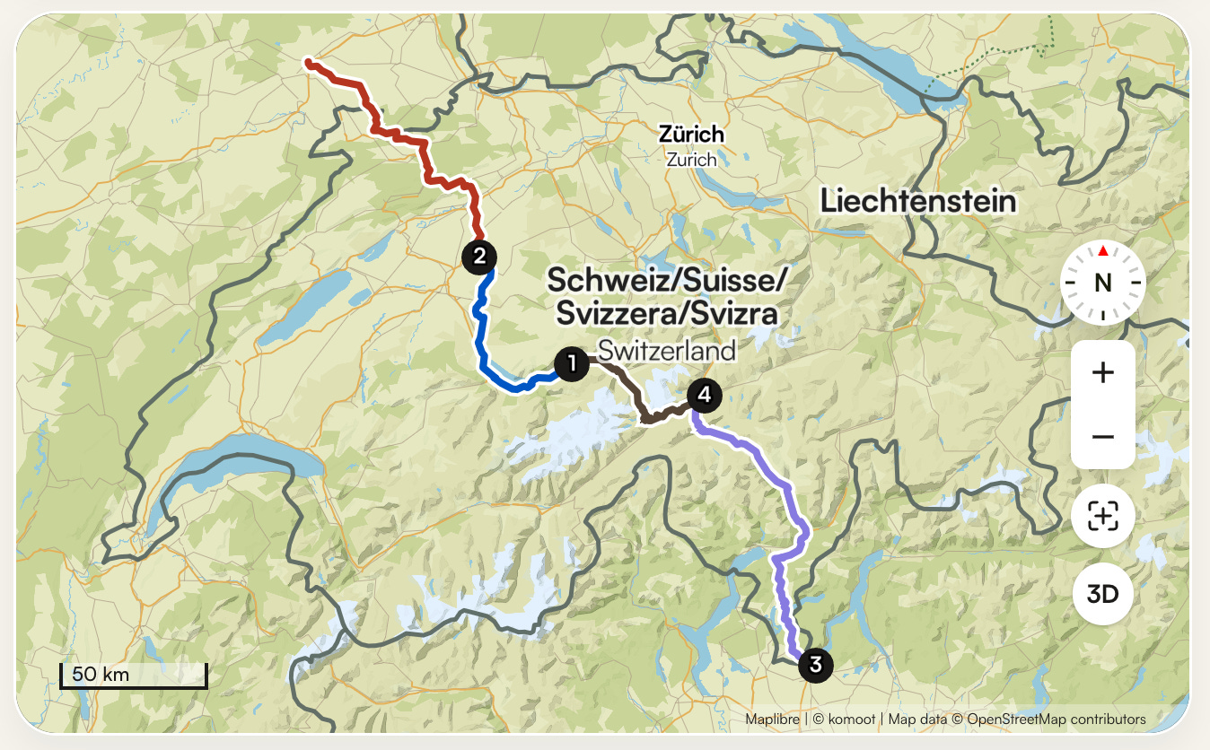 The route includes three iconic Alpine climbs: Tremola San Gottardo, Furka Pass (Wes Anderson hotel), Grimsel Pass.